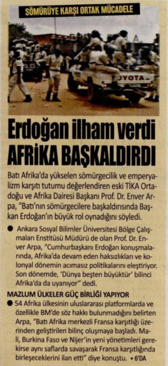 Haberde gazeteye konuşan Ankara Sosyal Bilimler Üniversitesi Bölge Çalışmaları Enstitüsü Müdürü Prof. Dr. Enver Arpa, “Son dönemde ‘Dünya beşten büyüktür’ bilinci Afrika’da uyanıyor” dedi.