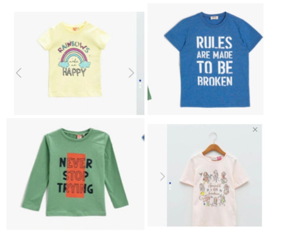 Kız çocuklar için üretilen tişörtlerin üzerine “Gökkuşağı beni mutlu ediyor.” ve “Etrafına kibarlık saç” cümleleri basılmış.