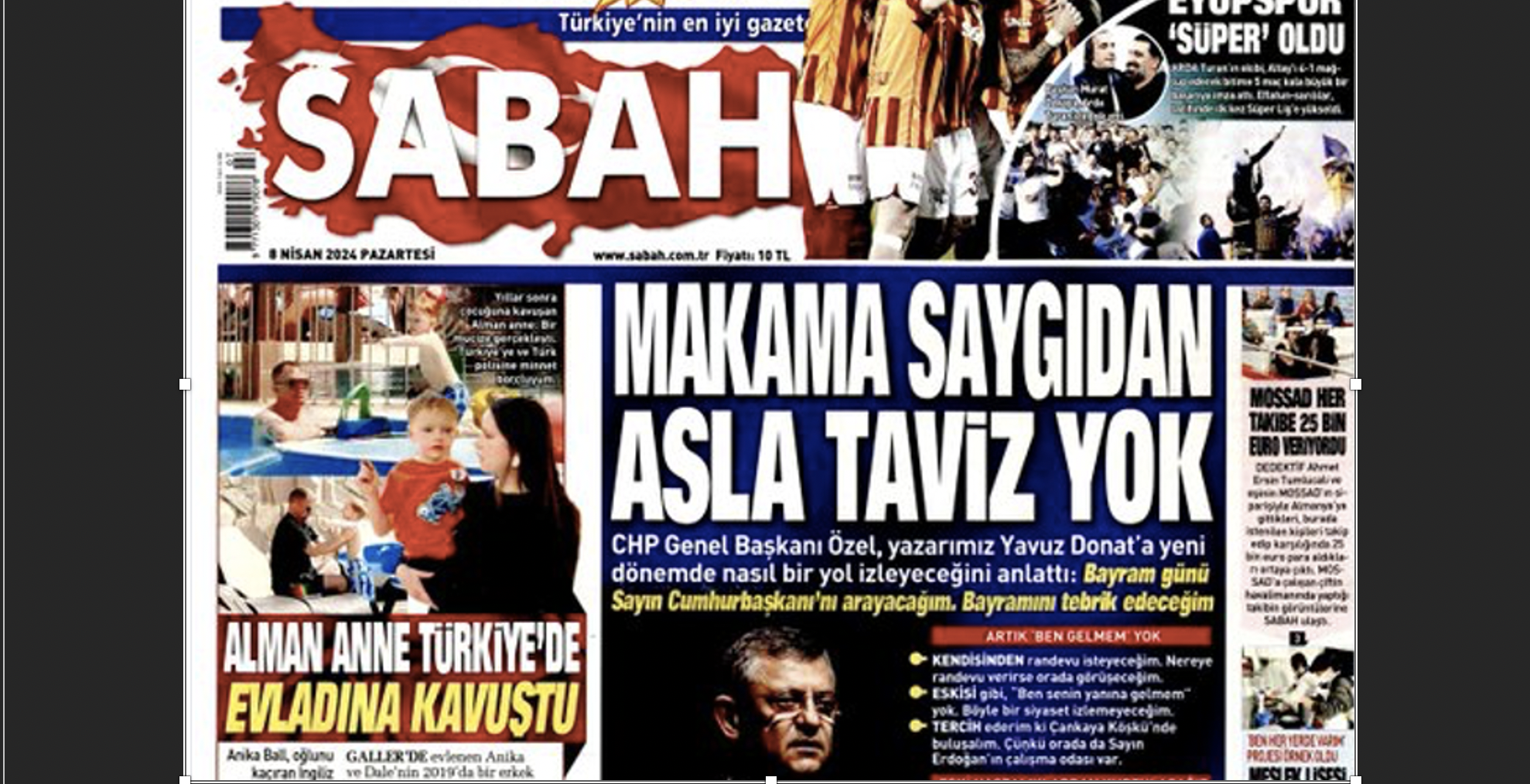 Cumhurbaşkanı Erdoğan’ın damadı Berat Albayrak’ın ağabeyi Serhat Albayrak tarafından yönetilen iktidar medyasının amiral gazetesi Sabah Gazetesi’nin yazarı Yavuz Donat, CHP Genel Başkanı Özgür Özel ile röportaj yaptı ve röportajı Sabah sürpriz bir biçimde manşetinden verdi. Erdoğan’a sıcak mesajlar gönderen Özel’in “Makama saygıdan asla taviz yok” sözlerinin öne çıkarıldığı manşet kulisleri hareketlendirdi. Serbestiyet’in Ankara’da AK Parti ve Beştepe çevrelerinden elde ettiği bilgilere göre manşetten Erdoğan’ın önceden haberi yoktu. Erdoğan, Özgür Özel’li Sabah manşetine tepki gösterdi.