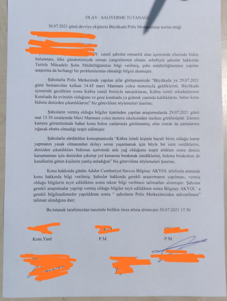 “Karakolda polisler birini çağırdı. Bilirkişi gibi biri. O kişi geldi bidonu inceledi ve içindekinin suyla karışık yağ olduğunu söyledi. Buna rağmen 2-3 saat daha karakolda vakit geçirdik. Kamera kayıtlarını incelediler, hangi saatte inmişiz, ne yapmışız, bütün sorduklarını teyit ettiler. Hiçbir şey çıkmadı. Yanıcı madde yok. Bizimle ilgili de bir şey çıkmadı. Salıverilme tutanağı da var elimizde. Büyükada Polis Merkezi’nden doğrudan salıverildik, herhangi bir suçlama, soruşturma yok. Hiçbir şey yok.