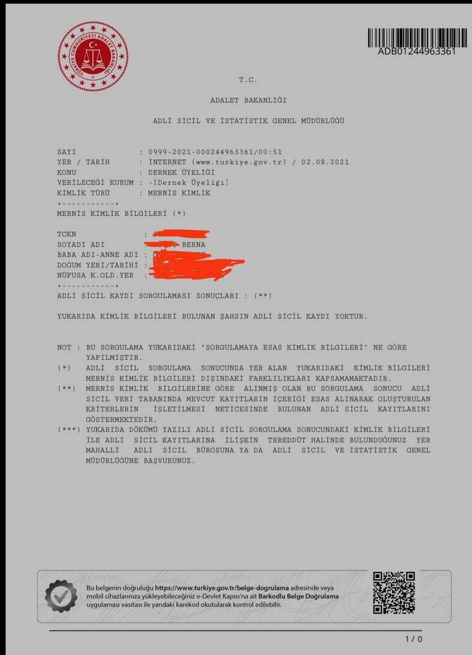 Berna Söğüt’ün adli sicil belgesi.