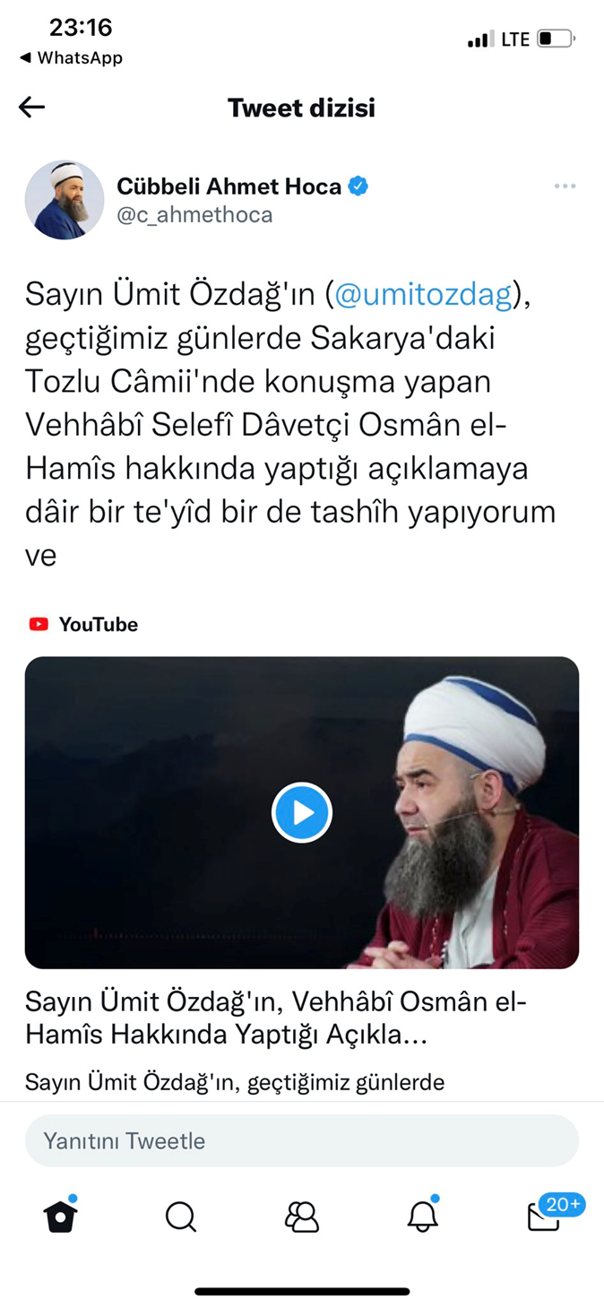 “Sayın Ümit Özdağ’ın geçtiğimiz günlerde Sakarya’daki Tozlu Camii’nde konuşma yapan Vehhabi Selefi Davetçi Osman el-Hamis hakkında yaptığı açıklamaya dair bir teyit bir de tashih yapıyorum ve Diyânet’i, Vehhâbîleri konuşturmama husûsunda uyarıyorum. Aksi takdirde iç savaşa destek vermiş olacaklardır.