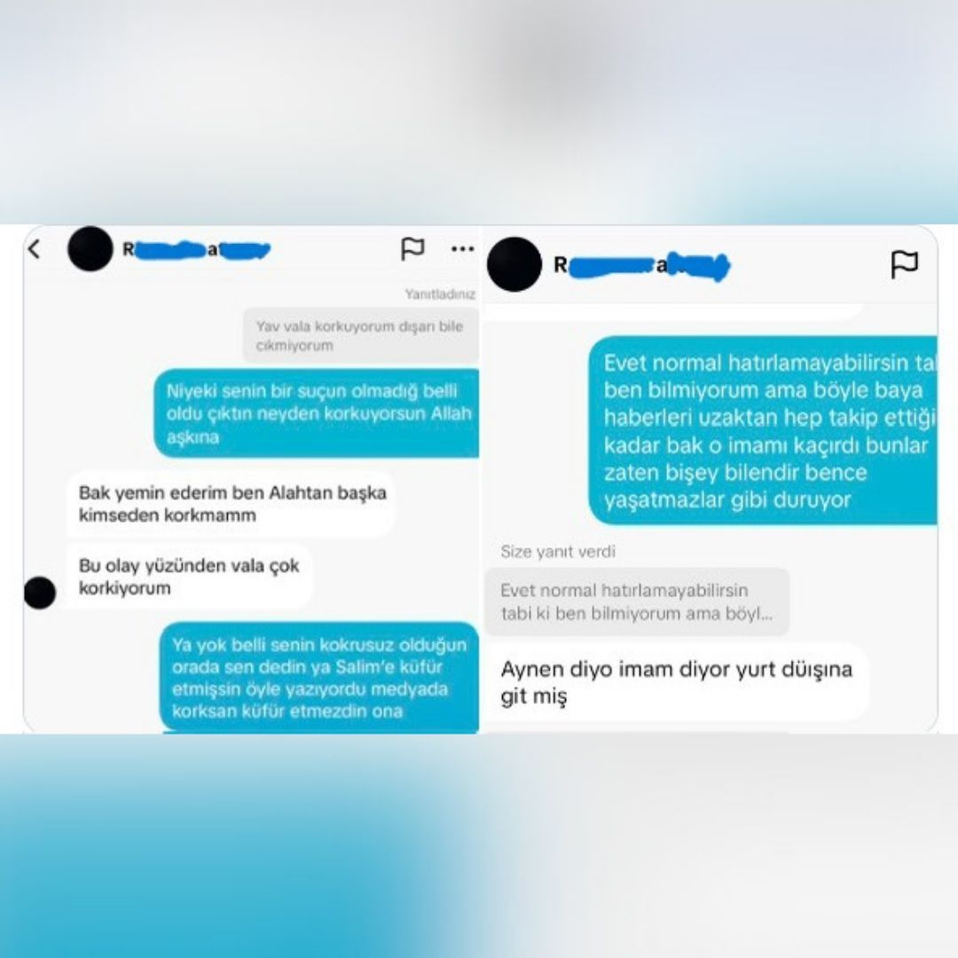 Kullanıcı adı görünmeyen hesaptan, R.A.’nın olduğu iddia edilen hesaba atılan bir mesajda, “O imamı kaçırdı bunlar, bence yaşatmazlar gibi duruyor” ifadesi yer alıyor.