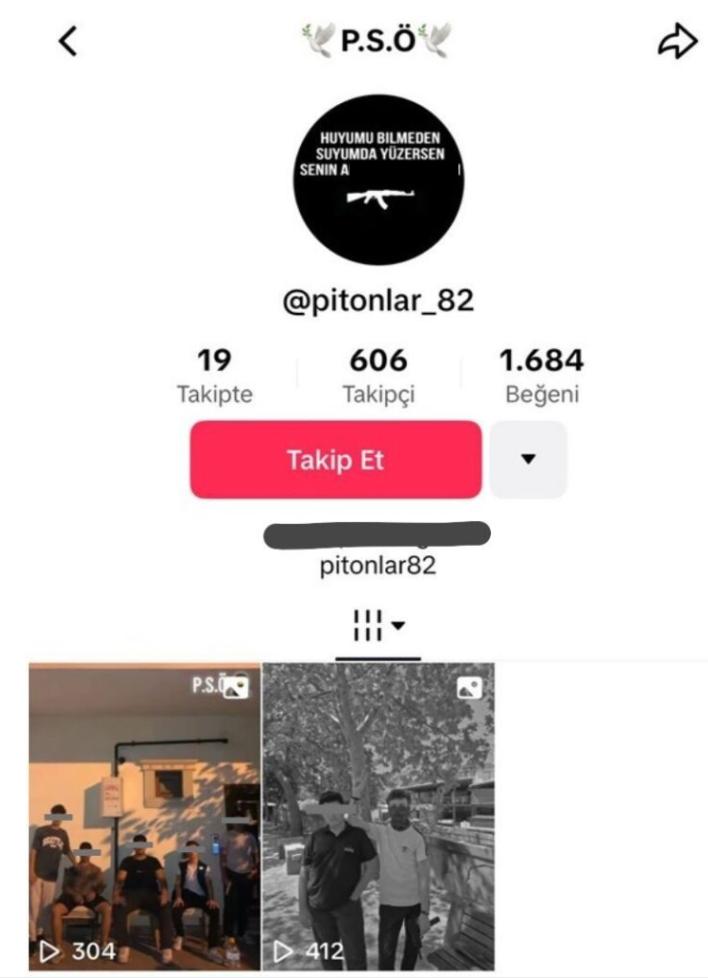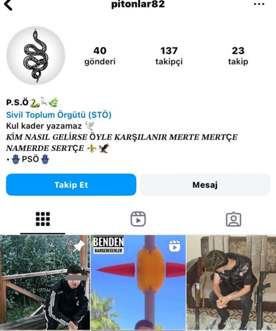 Pitonlar 82 adlı grubun Instagram ve TikTok hesaplarında grup üyelerinin yüzlerini saklayarak silahlarla çektirdikleri fotoğraflar bulunuyor.