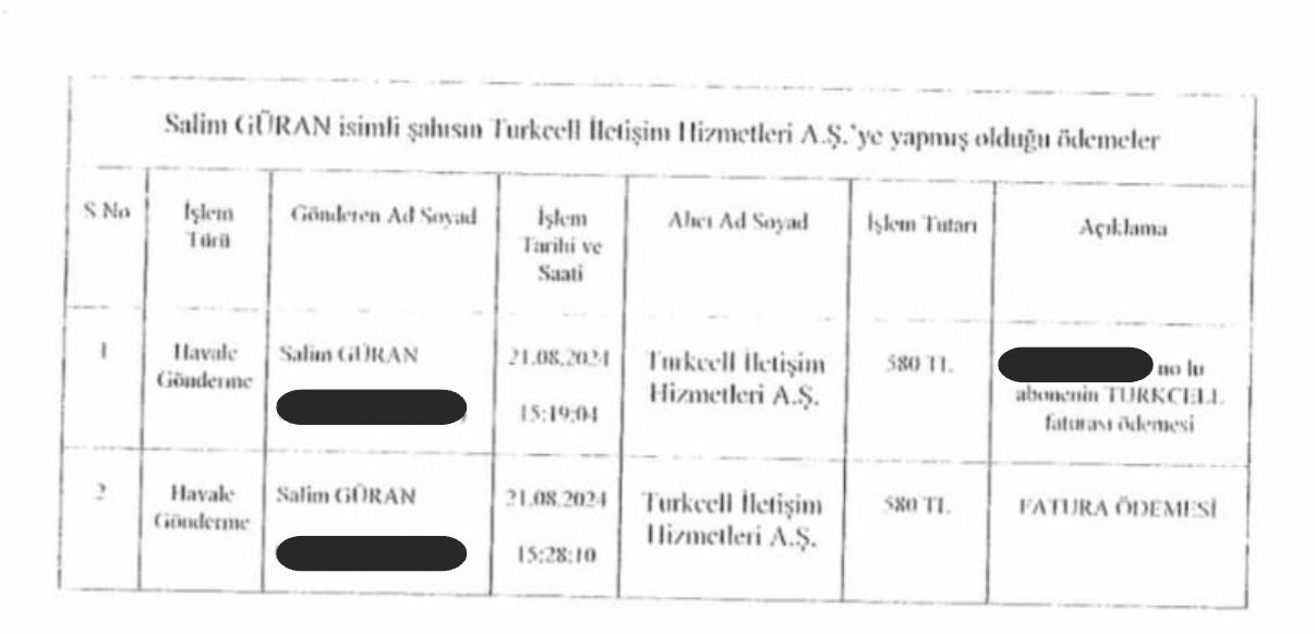 Salim Güran’ın dava dosyasına giren bankacılık işlemleri kayıtlarında, cinayet günü saat 15.19’da ve 15.28’de birer telefon faturası ödediği görülüyor.