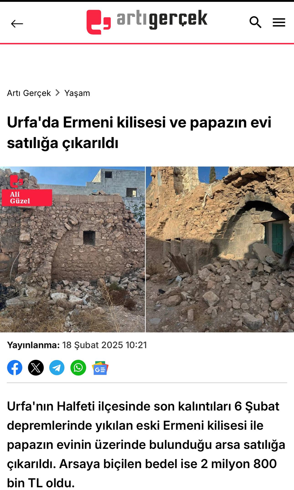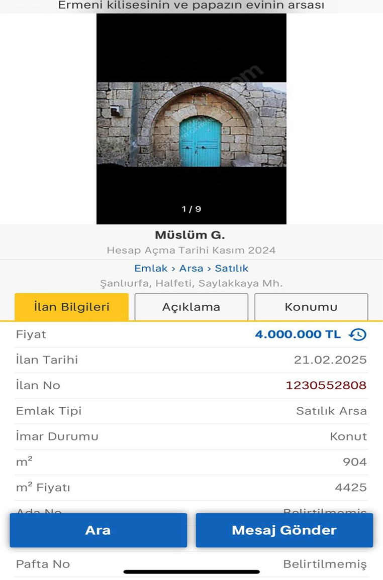 “Şanlıurfa Halfeti kilise ve papazın evinin arsası satılık” başlığıyla paylaşılan ilan, tarihi mirasın satışa çıkarıldığı şeklinde yorumlandı. Söz konusu yapının bulunduğu köyde birçok yer 2019 yılına kadar sit alanı olarak değerlendiriliyordu.