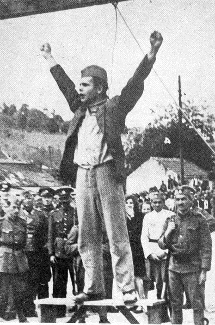 [Stjepan Filipovic. 26 yaşında.] Yakalanmış, idam sehpasında, boynunda ip, kollarını havaya kaldırmış, halkı isyana ve direnmeye çağırıyor. [Smrt faşizmu, sloboda narodu. Faşizme ölüm, halka özgürlük.]