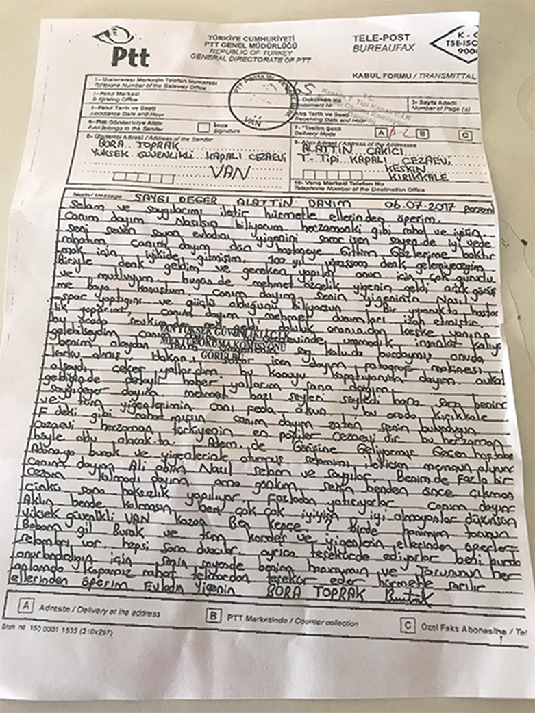 “Van’da ringde haberim olmadan gelişen olayla ilgili basında bir yazı çıkmıştı. Gönderdiği mektuptan anladım ki kan bağım olmayan ama kan bağımdan daha yakın yeğenim olan, yeğenim Bora Toprak’ın yaptığını göndermiş olduğu mektuptan anlaşılmaktadır.