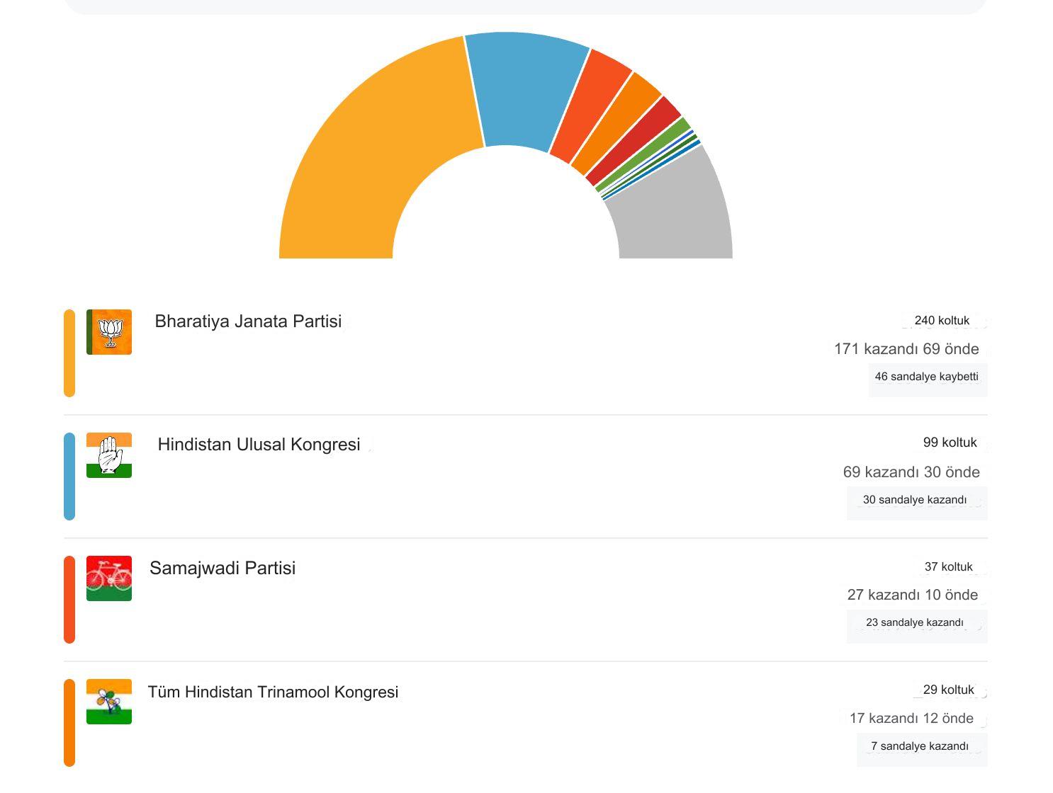 Süren oy sayımına göre Başbakan Modi’nin partisi BJP on yıl aradan sonra Hindistan parlamentosundaki çoğunluğunu kaybediyor. BJP’nin ittifakı NDA ise oylar sayıldıkça sandalye kaybediyor.