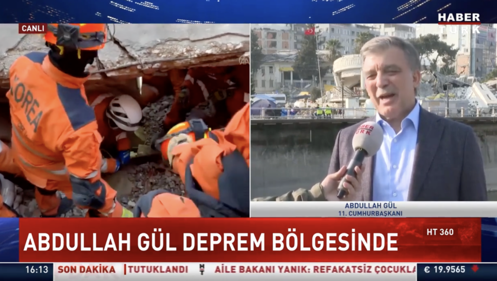 Hatay'a giden 11. Cumhurbaşkanı Abdullah Gül Habertürk canlı yayınına katıldı: "'Türk'ün Türk'ten başka dostu yoktur' gibi söylemlere inanırız. Halbuki öyle değil", "Böyle acı bir günde başta komşular olmak üzere en uzak bölgelerden, fakir-zengin ayrımı yapmadan herkesin koştuğunu görmek gerekir".