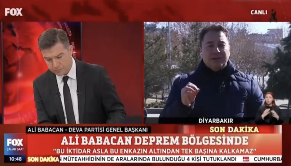 DEVA Partisi Genel Başkanı Ali Babacan, deprem felaketi nedeniyle yaşanan "seçim ertelensin mi?" tartışmaları hakkında konuştu: "Savaş ortasında bile TBMM çalışmıştır bu ülkede. Savaş döneminde seçim yapılmıştır bu topraklarda. Bu ülkenin bu kabiliyeti var."