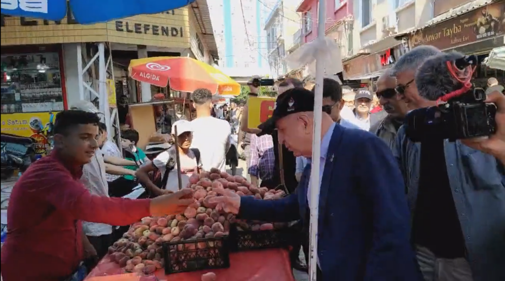 Hatay'da bulunan Zafer Partisi Genel Başkanı Ümit Özdağ bir pazarı gezerken Suriyeli pazarcı bir genç, Özdağ'a "Size yıkayayım. Bu lezzetlidir, tadına bakın" diyerek bir şeftali ikram etti. Özdağ, "Lezzetli mi? Sağ ol aldım bir tane" diye karşılık verdi.