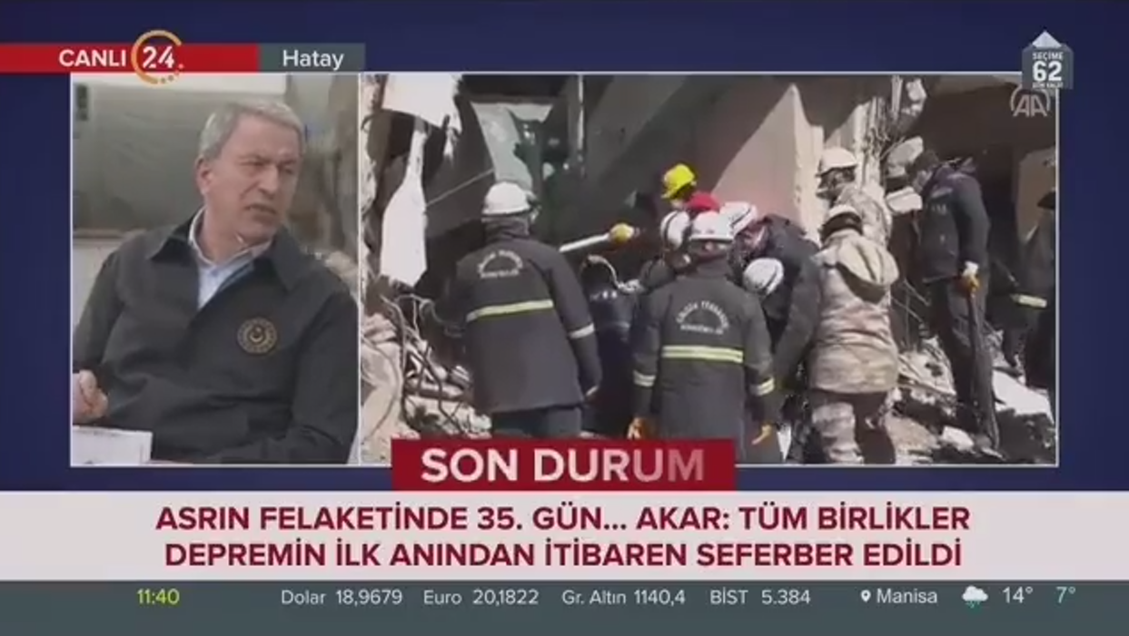 Milli Savunma Bakanı Hulusi Akar: "TSK'da arama kurtarmayla ilgili kim varsa ilk andan itibaren seferber ettik. TSK İnsani Yardım Tugayı'nda 34 arama kurtarma timimizi, ilave güç olarak 23 istikam kurtarma timini bölgeye yolladık. Teknik personelden ve işçilerden de 80 tim oluşturduk."