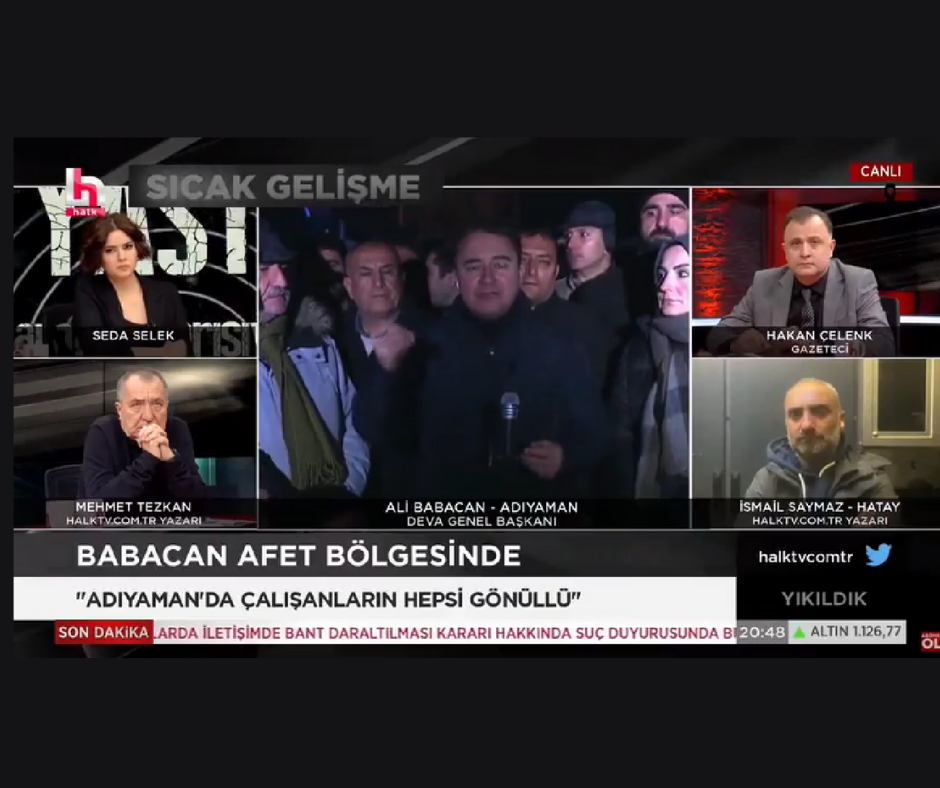 Adıyaman'dan Halk TV yayınına bağlanan DEVA Partisi lideri Ali Babacan: "Merkezden talimat gelmeden kimse kılını kıpırdatmıyor. Oysa böyle bir olayda muhtarlara kadar yetki verilmesi lazım. Depremde kimin ne görev alacağının önceden belli olması, deprem olunca telefonlarına 'görev alanınız şurası' diye SMS gitmesi lazım."