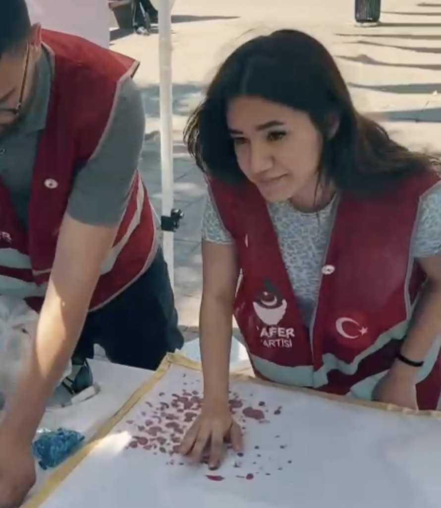 İstanbul'da Zafer Partisi'nin kurduğu stanttaki beyaz bez üzerine parmak ucundan kanlarını sürenler bayrak yapmaya çalıştı.