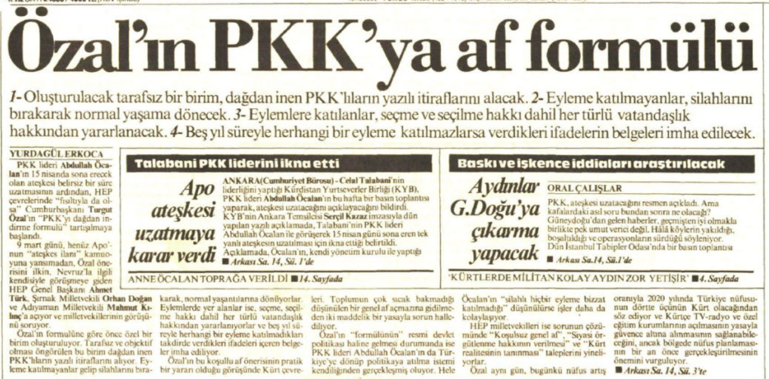 Özal, Öcalan’a da aracılarla gönderdiği aklındaki formülü, 9 mart 1993 günü Nevruz’la ilgili kendisiyle görüşmeye gelen HEP Genel Başkanı Ahmet Türk, Şırnak Milletvekili Orhan Doğan ve Adıyaman Milletvekili Mahmut Kılınç’a anlattı.
