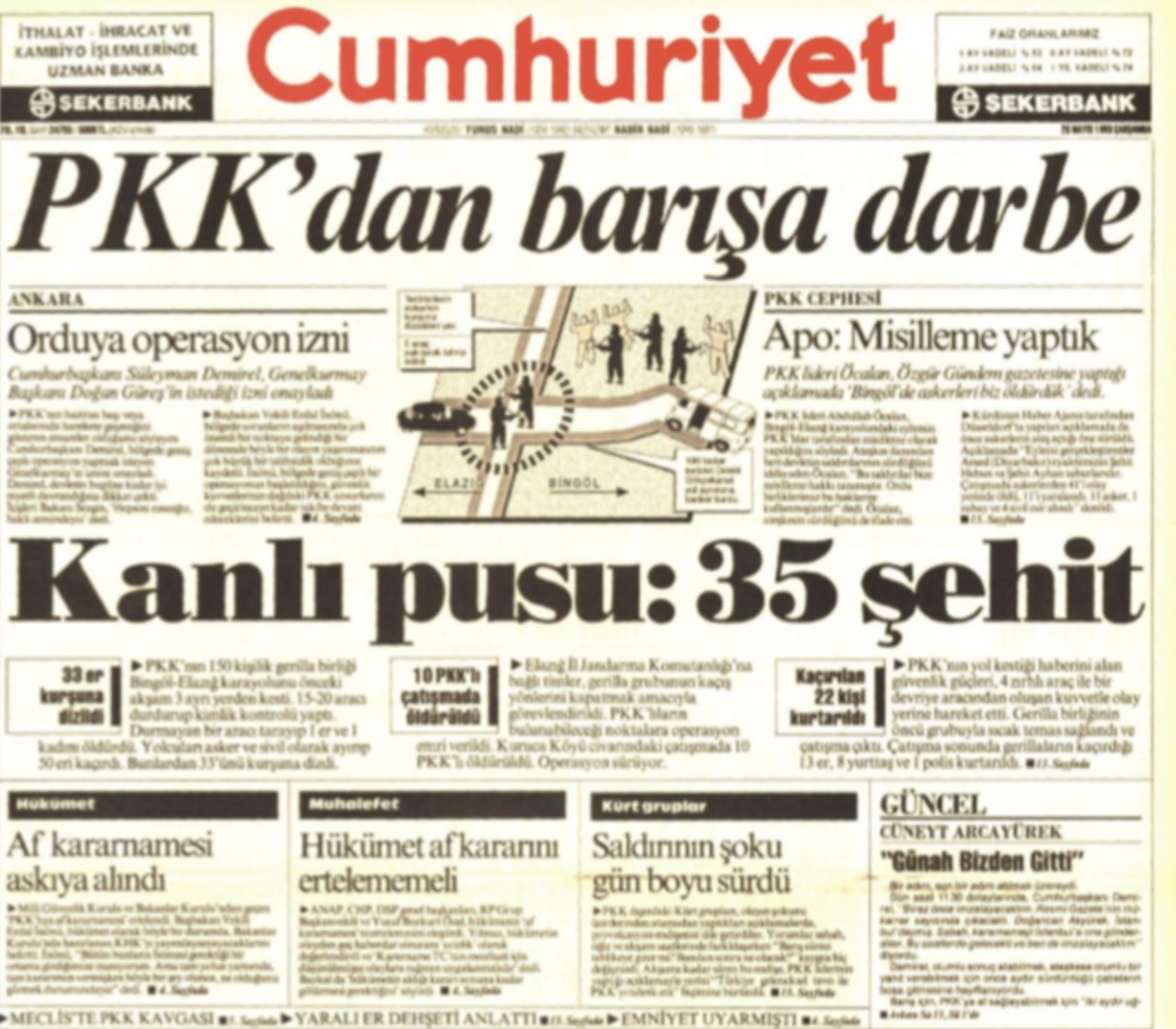 Ama bu barış manşetli gazetelerin çıktığı sabah, Türkiye MGK toplantısının gecesinde Elazığ-Bingöl karayolunda 33 silahsız erin PKK tarafından öldürüldüğü haberiyle sarsılmıştı.