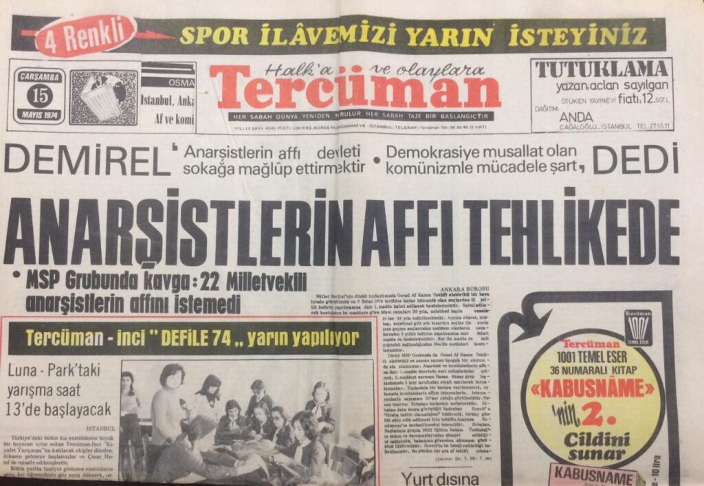 Mayıs 1974’te çıkarılan Genel Af Kanunu görüşmeleri sırasında cezaevindeydik. CHP-MSP koalisyonu dönemiydi. İki parti ve iki lider, askeri darbenin cezaevine doldurduğu muhalifleri, solcu gençleri, sağcıları (çok az sayıda da olsa) özgürlüklerine kavuşturmak için anlaşmışlardı. Biz de içeride radyodan kanun tasarısının görüşülmesini ve madde madde oylanmasını izledik.