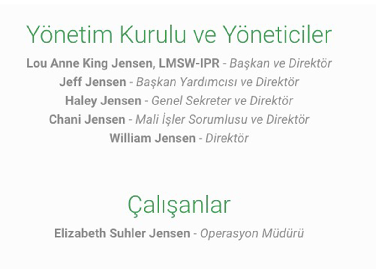 Vakfın başkanı Lou Anne King Jensen, başkan yardımcısı Jeff Jensen karı-koca. Vakfın genel sekreteri Haley Jensen, Mali İşler Sorumlusu Chain Jensen ve direktörü William Jensen ise onların çocukları. Vakfın operasyon müdürü Elizabet Jensen de yakın akrabaları.
