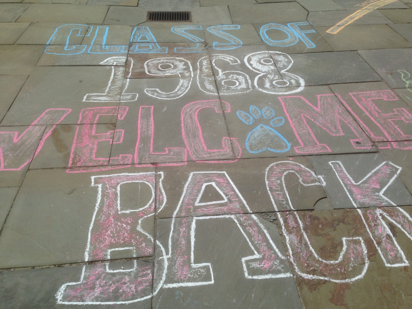 Amerikan üniversitelerinin mezun dernekleri çok iyi çalışır, çok iyi organize eder böyle şeyleri. Yukarıda, tepedeki resim: “1968 mezunları, tekrar hoşgeldiniz.” Kalacağımız kolejin önünde, kaldırımı böyle boyamışlar. Bizde olmayan bir kültür, bilinmeyen bir zanaat. Geçelim. Ben de benim gibi üç dört yüz septuagenarian “yetmişlik”le buluştum, eski padişah ve sadrazam otağlarının kimbilir kaç misli bir çadırın altında. Tanıdık tanımadık herkese usulen selâm verdim, merhaba dedimse de, asıl beş on kişiyle daha uzun sohbet ettim, hasret giderdim.