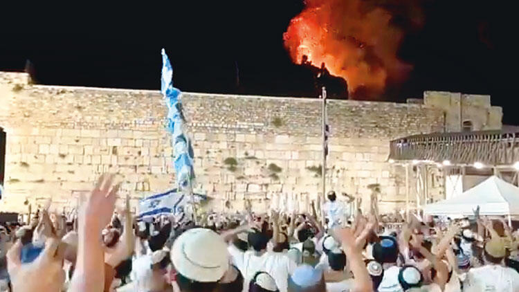 Yukarıda Filistinli gençler, aşırı sağcı gençlerin oluşturduğu kortejin Mescid-i Aksa’ya çıkmasını engellemek için İsrail polisiyle çatışırken, aşağıda Ağlama Duvarı’nın önünde Kudüs Günü için yapılan bayrak yürüyüşüne katılan çoğunluğu Yeşiva denen dini okulların öğrencileri toplanmıştı.