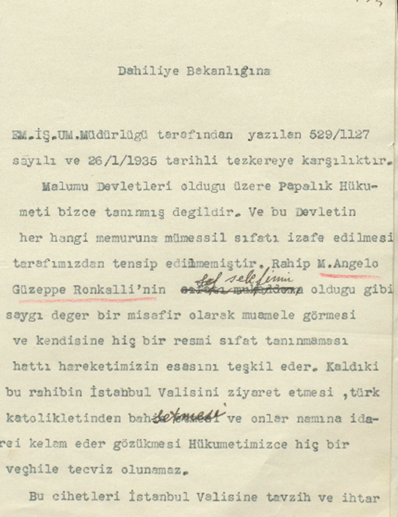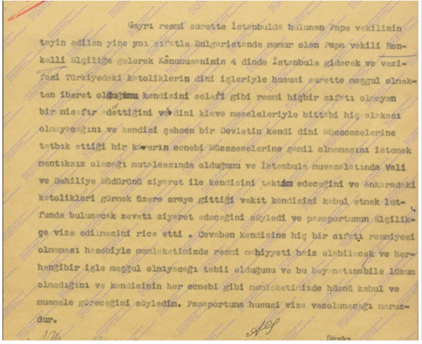 “Gayrı resmî surette İstanbul’da bulunan Papa vekilinin tayin edilen yere yine gittiği, Bulgaristan’da memur olan Papa vekili Roncalli sıfatıyla gelerek kanununun 4. fıkrası dâhilinde İstanbul’a gidecek ve vazifesi Türkler’deki Katoliklerin dinî işleriyle bizzat surette meşgul olmaktan ibaret olduğunu, kendisinin selefi gibi resmî hiçbir sıfatı olmayan bir misafir bulunduğunu ve dinî kıyâfe meseleleriyle hiçbir ilgisi olmadığını ve kendisi şahsen bir devletin kendi dinî müesseselerine tatbik ettiği bir kararın ecnebi müesseselerine şâmil olmasını isteyecek mantıksız olacağını mutalâasından olduğunu ve İstanbul’a muvassalatında Vali ve Dahiliye Müdürünü ziyaret ile kendisini takdim edeceğini ve Ankara’daki Katolikleri görmek üzere oraya gittiği vakit kendisini kabul etmek lütfunda bulunacak zevâtı ziyaret edeceğini söyledi ve pasaportunun düştükçe vize edilmesini rica etti.