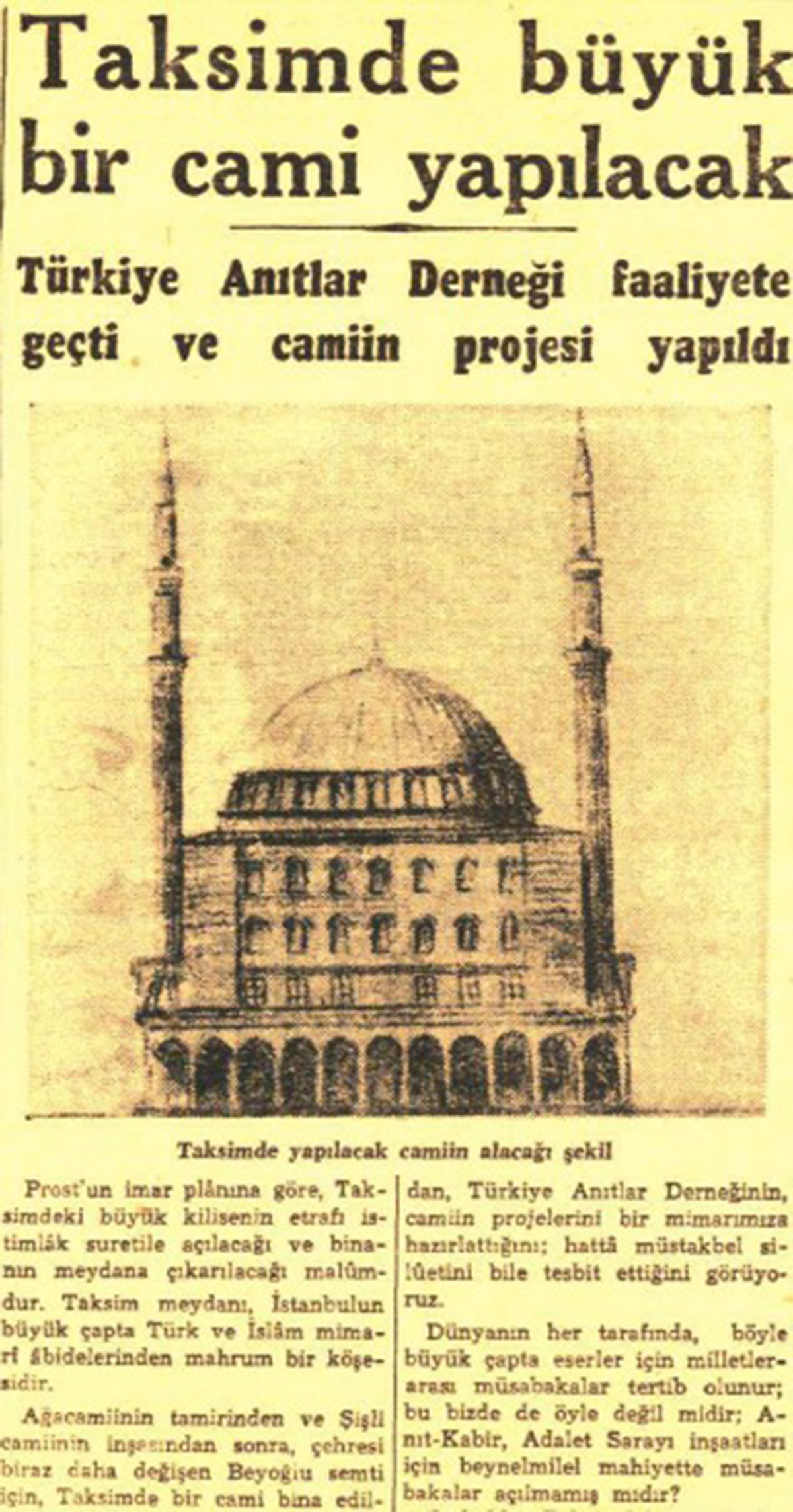 “Taksim Meydanı, İstanbul’un büyük çapta Türk ve İslam mimari abidelerinden mahrum bir köşesidir. Ağa Camii’nin tamirinden ve Şişli Camii’nin inşasından sonra çehresi biraz daha değişen Beyoğlu semti için Taksim’de bir cami inşa edilmesi düşünülmektedir. Merkezi Ankara’da bulunan Anıtlar Derneği bu hususta şimdiden harekete geçtiğini, düşünülen caminin projesini bile tespit ettirdiğini öğrenmiş bulunuyoruz…”