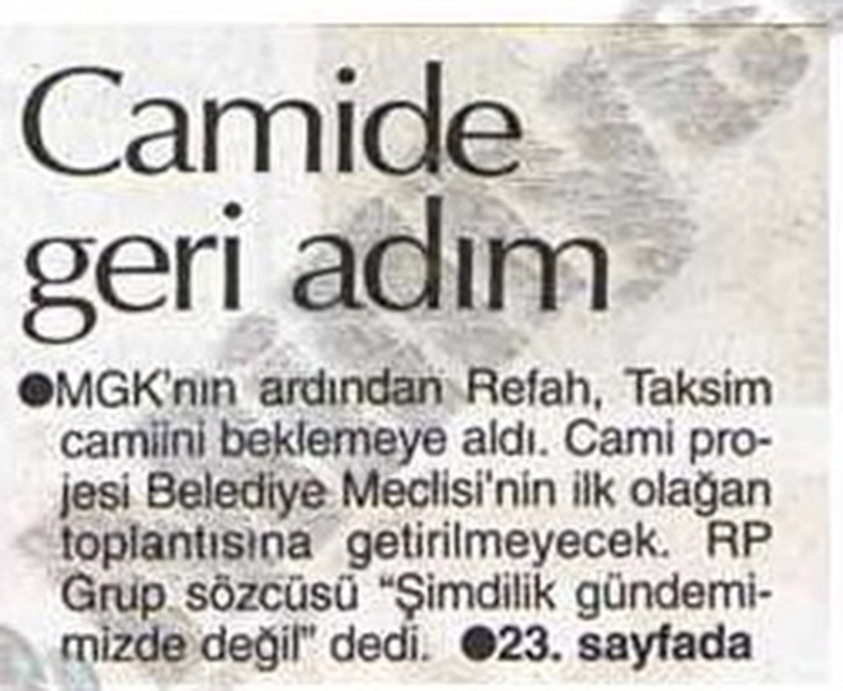 28 Ocak 1997 günkü gazetelerde Taksim Camii’nin temelinin 29 Mayıs İstanbul’un Fethi yıl dönümünde atılacağı haberleri vardı.