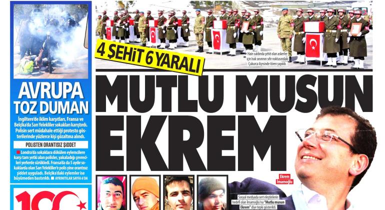 Şimdi lütfen, nasıl vazgeçsin bu “sayın gyy vatandaş” (12 Mart rejiminin ikide bir radyodan çağrıda bulunduğu “sayın muhbir vatandaş” misali), yıllardır alıştığı, varlık nedeni haline gelen, uğrunda başka herşeyi unuttuğu ve hani “on satırlık bir doğru haber, gerçek haber, dürüst haber yaz” dense onu da beceremeyeceği mecradan? Elinizi vicdanınıza koyun da söyleyin; kendilerinden bunu talep etmek son derece haksız ve insafsız olmaz mı? Nitekim dökmüşler ellerinin olanca hünerini gene ortaya. Bugün “MUTLU MUSUN EKREM” manşetini çekmişler büyük puntolarla, altı sütun üstüne. Ekrem İmamoğlu’nun “teröristleri cesaretlendirme”siyle Irak sınırında PKK’nın öldürdüğü dört şehit arasında bir bağlantı kuruyorlar. Bu da herhalde 19 Mart gecesi tv programının devamı oluyor.