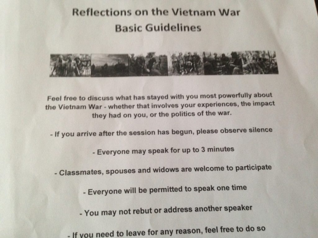 Jacques Leslie’nin bu dökümü gayet realistmiş — çünkü 31 Mayıs öğleden sonraki özel Vietnam’ı Hatırlamak oturumuna neredeyse bire bir yansıdı. Mezuniyet Komitesi toplantı prosedürünü bazı basit fakat çok önemli kurallara bağlamıştı. Amaç, aynen program broşüründeki başlıkta ifade edildiği gibi, herkesin “geçmişimiz”e ilişkin “kişisel düşünce”lerini dile getirmesine olanak sağlamaktı. Dolayısıyla özel panelist veya konuşmacılar diye bir şey yoktu, çünkü prensip olarak herkes konuşmacı olabilirdi. Müzik Fakültesi’nin ana konser salonunun girişinde dağıtılan kağıtlarda (bkz. yukarıda, en tepedeki resim), “Vietnam Savaşı’nın üzerinizdeki en güçlü etkisi ne olduysa” serbestçe dile getirmeniz öneriliyordu. İsteyen el kaldırıp söz isteyecek; mikrofon dolaştırılacak; herkes sadece bir defa ve 3 dakika süreyle konuşabilecek; en önemlisi, kimse “başka bir konuşmacıya cevap vermeye veya başka bir şekilde hitap etmeye” kalkmayacaktı (You may not rebut or address another speaker). Bu bir tartışma, münazara veya iktidar mücadelesi değildi; kazananı veya kaybedeni olmayacaktı. Düzenleyiciler kutuplaşmayı değil, sakin ve olgun bir atmosferde farklılık ve çeşitliliğin sergilenip kabullenilmesini amaçlıyordu.