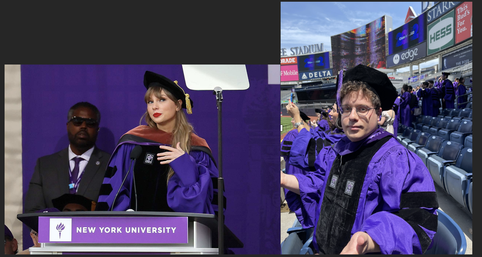 Okuyucuya not: Taylor Swift’in Yankies Stadyumu’ndaki fahri doktora mezuniyetinde ben de New York Üniversitesi Uluslararası Hukuk Yüksek Lisansı’ndan mezun oluyordum. Yukarıdaki fotoğraf, mezuniyet konuşmamızı ünlü bir siyasetçi yerine Taylor Swift’in yapmasına tepki gösterdiğim bir ana ait: “Gele gele Amerika’nın türkücüsüne mi denk geldik? Nerede Obama?” O zamanlar Swift’in şarkılarından ve hikayesinden bihaberdim. Dönem arkadaşım Taylor’dan ve hayranı olan tüm Swiftie’lerden özür dilerim.