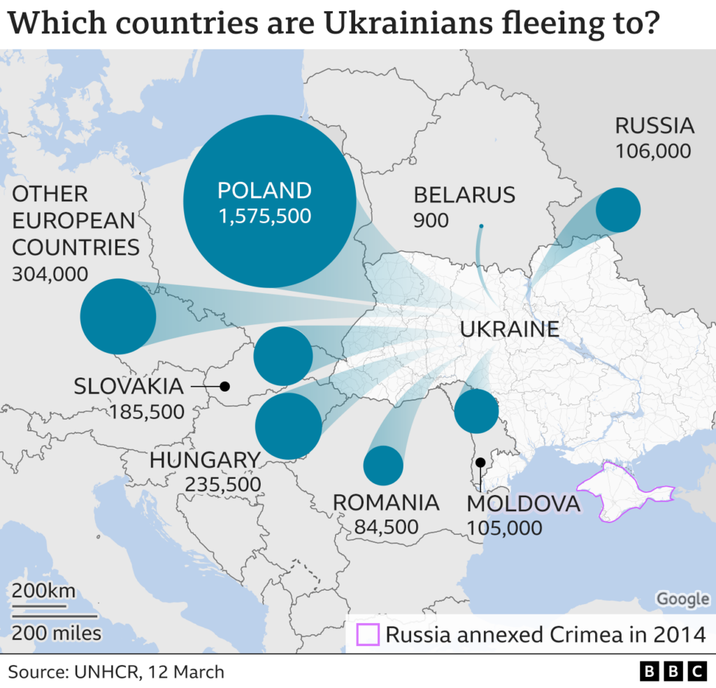 * Kırk milyon nüfuslu Ukrayna’dan komşu ülkelere kaçan sığınmacı sayısı 2.5 milyonu buldu. Bunun 1.6 milyon kadarı Polonya’da (bkz tepedeki harita). Küçücük Moldovya ise 100,000 küsur mülteci ile “kırılma noktası”na dayanmakta.