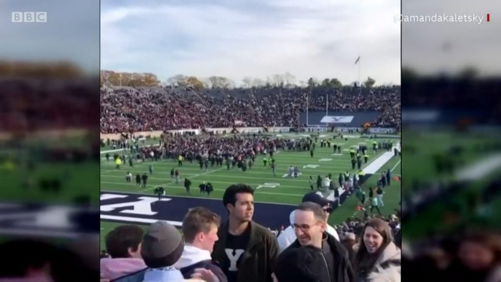Baktım; meğer evet, işin içinde bir iş varmış gerçekten. Devre arasında, 80,000 kişilik Yale stadyumunda, her iki üniversitenin hem öğrenci, hem mezunlarından oluşan yüzlerce seyirci, planlı bir gösteri halinde ansızın inivermiş sahaya. Yale and Harvard United for Climate Justice (İklim Adaleti Uğruna, Yale ve Harvard Elele) yazılı pankartlar açmışlar. Derken bu hazırlıktan haberi olmayan seyirci ve oyuncular da onlara katılmış. Harvard takım kaptanı Wesley Ogsbury, her iki üniversitenin vakıf fonlarından “geleceğimizi yoketmekte olan” bazı sanayilere yatırım yapılıyor olmasını kınamış. “Harvard ve Yale, bir yandan kamuoyunu yanıltmakta, akademiklere kara çalmakta ve gerçekleri inkâr etmekte olan şirketleri desteklerken, bir yandan da aslen bilgiyi yüceltmekte olduklarını iddia edemezler” demiş.